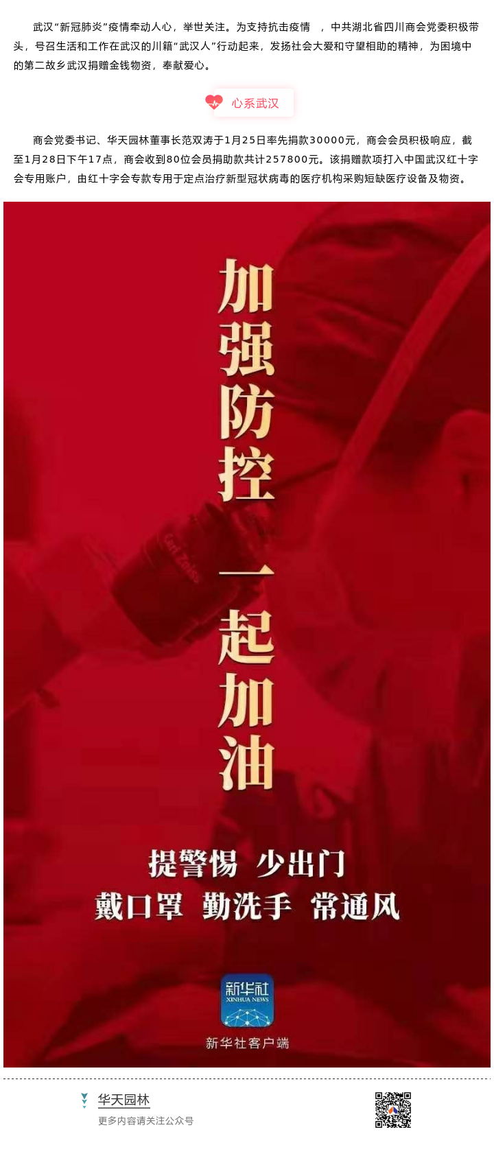 【概要描述】武漢“馨冠肺炎”疫情牽動(dòng)人心,舉世關(guān)注。為支持抗擊疫情,中共湖北省四川商會(huì)黨委積極帶頭,號(hào)召生活和工作在武漢的川籍“武漢人”行動(dòng)起來(lái),發(fā)揚(yáng)社會(huì)大愛(ài)和守望相助的精神,為困境中的第二故鄉(xiāng)武漢捐贈(zèng)金錢(qián)物資,奉獻(xiàn)愛(ài)心。