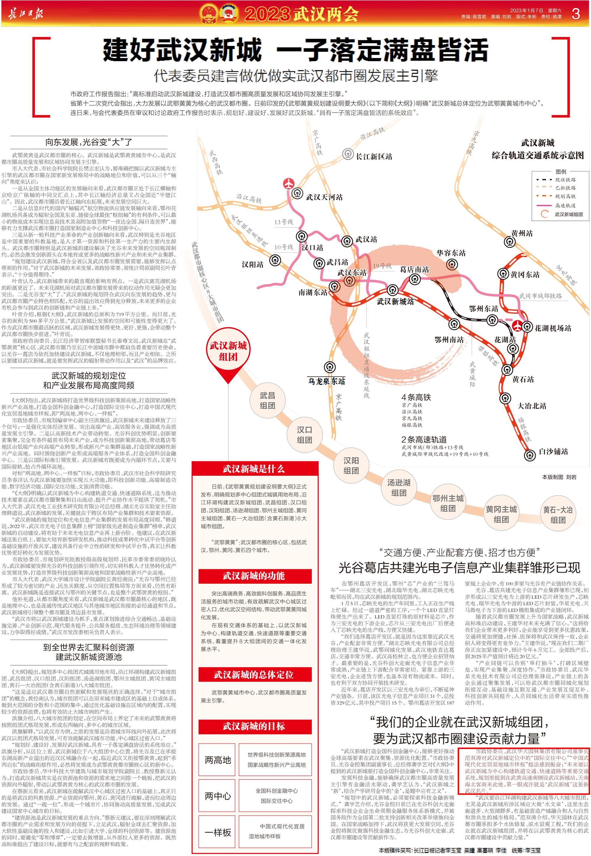 1月7日,長江日報刊發(fā)2023兩會專版,范董事長提出的“優(yōu)化營商環(huán)境同發(fā)達城市形成比較優(yōu)勢”的建議被收錄其中。針對武漢市政府工作報告提出的“高標準啟動武漢新城建設,打造武漢都市圈高質量發(fā)展和區(qū)域協同發(fā)展主引擎”,范董事長對武漢新城定位中國的“國際交往中心”、“中國式現代化宜居濕地城市樣板”提法感到振奮建議,他說,“未來要以武漢新城為中心構建軌道交通、快速道路等重要交通系統,規(guī)劃里提到在武黃高速南側設武漢新城站,天南海北客商來此地,第一眼或許就是‘武漢新城’這張新武漢名片。”他建議武漢新城所涉區(qū)域應大做“水文章”,營造產城融合和人與自然和諧共生的城市格局。同時他也表示,武漢華天園林在武漢都市圈承擔多個水體修復、濱水景觀工程,愿在以武鄂黃黃為核心的武漢都市圈建設中貢獻力量。