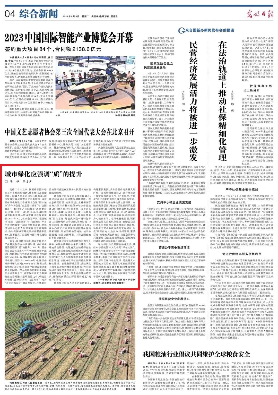 近日,北京林業(yè)大學(xué)副校長、中國風(fēng)景園林學(xué)會副理事長李雄教授,園林學(xué)院李方正副教授在《光明日報》發(fā)表署名文章《 城市綠化應(yīng)強調(diào)“質(zhì)”的提升》。